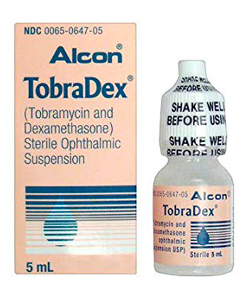 - Običajen odmerek tobramicina in deksametazon je 1–2 kapljici v obolelo oko na 4–6 ur, povečati na vsakih 2 uri v primeru hudih simptomov, ter uporabiti 5–14 dni.